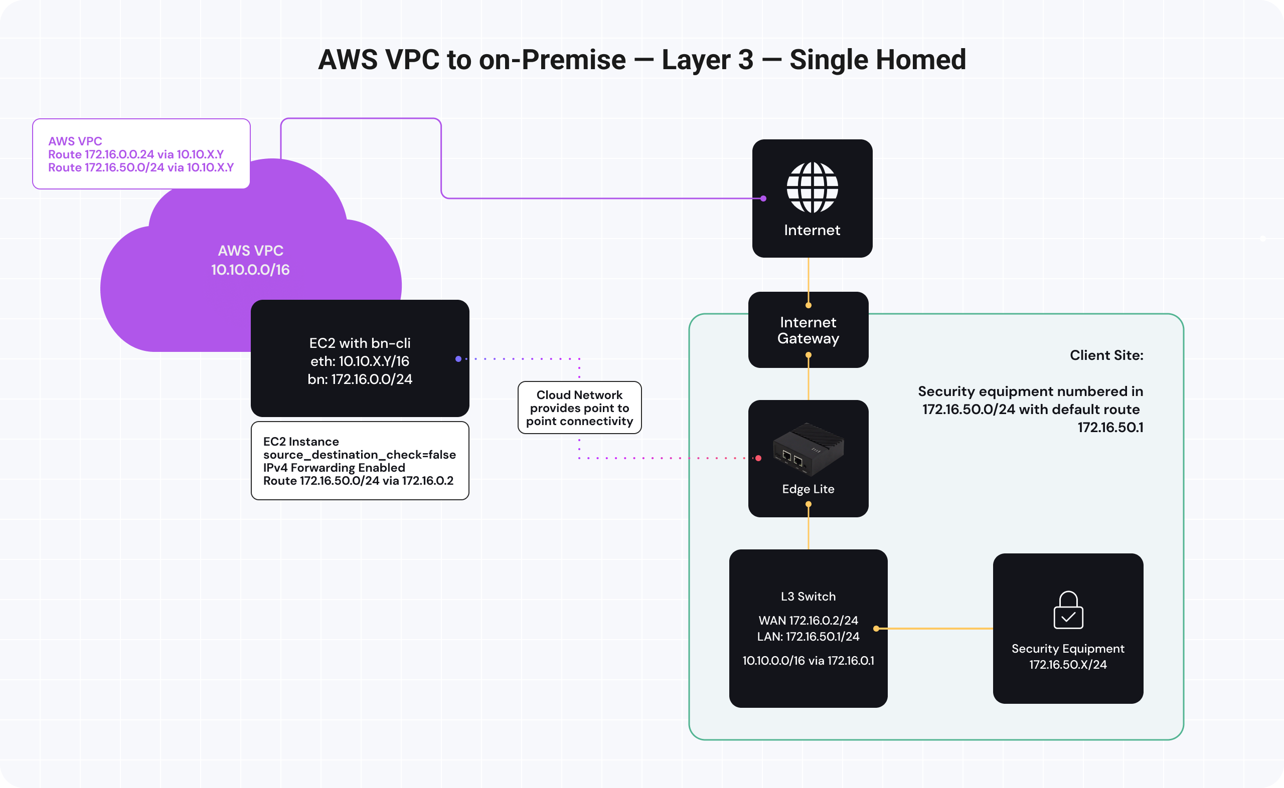 Finally, at the EC2 instance, a static route is required to forward traffic for 172.16.50.0/24 via the WAN interface IP on the Layer 3 switch. For multiple sites, a static route per location would be required.
